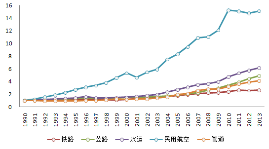 作為我國的經濟命脈,鐵路、公路、水路、民用航空、管道等運輸方式的快速發展促進了我國各區域之間的人員及貨物交流,促進了資源的合理配置。在1990-2013年間,我國各主要運輸方式在貨運量方面取得了飛速的增長,其中航空運輸的貨運量增速最為明顯;在結構方面也在不斷調整,鐵路運輸貨運量呈現降低趨勢而水路運輸貨運量呈現上升趨勢。