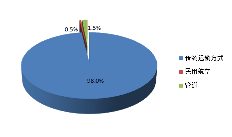 由圖3可知,傳統運輸方式在我國整體貨物運輸中仍然占主要地位。鐵路、公路及水路貨運量共占我國總體貨運量的98%以上。盡管民用航空及管道運輸在近年來發展迅速,但在我國總體貨運量中占比仍然較小。