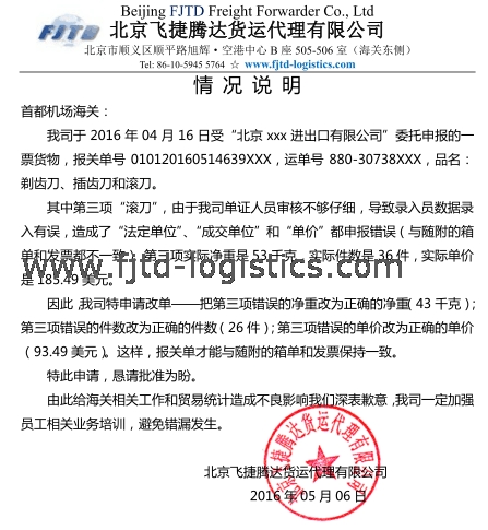 經常做報關的應該知道,在進出口申報中,并不是所有的申報錯誤都可以申請更改的,尤其是海關放行之后。如果你認為申報有誤,需要改單,就要寫《情況說明》,向海關書面解釋錯誤的原因、類型以及如何更改。海關會根據相關規定確定你的更改申請是否合理。如果合理,給予更改;如果不合理,不給更改。