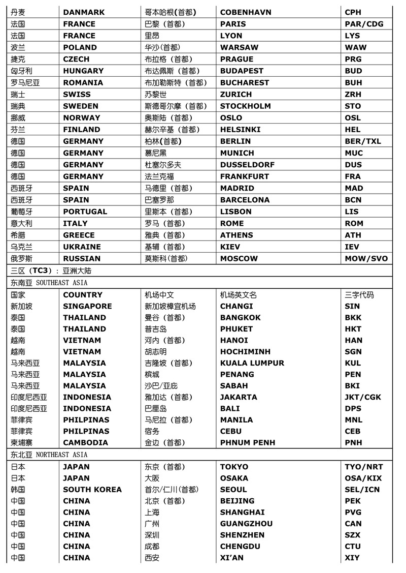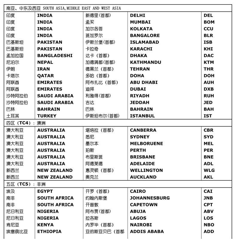 城市也有三字代碼。如:北京的城市碼為BJS——兩個(gè)機(jī)場(chǎng)分別為PEK和NAY;上海的城市碼為SHA——兩個(gè)機(jī)場(chǎng)分別為SHA和PVG;廣州的城市碼為CAN——機(jī)場(chǎng)代碼也是CAN;紐約的城市碼為NYC——4個(gè)機(jī)場(chǎng)分別為EWR、JFK、LGA和SWF;倫敦的城市碼為LON——6個(gè)機(jī)場(chǎng)分別為LHR、LGW、LCY、LTN、STN和SEN等。
