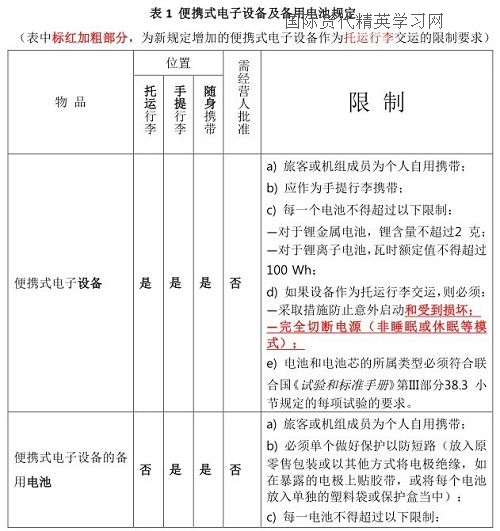 (表中標紅加粗部分,為新規定增加的便攜式電子設備作為托運行李交運的限制要求)