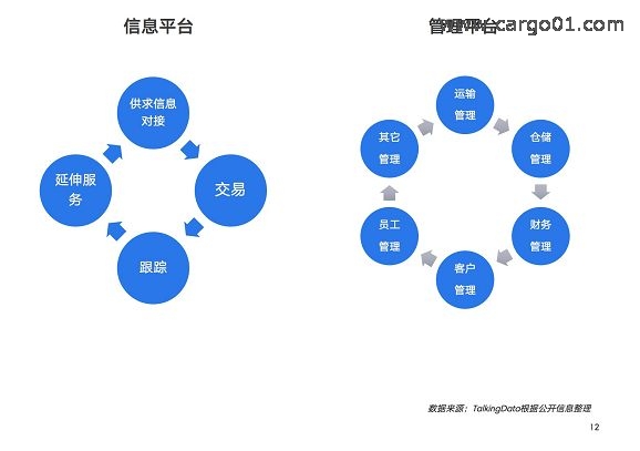 物流平臺分為兩類,信息平臺和管理平臺。信息平臺分為物流信息查詢平臺和物流信息交易平臺。查詢平臺主要以物流信息查詢和發布為主,交易平臺在查詢平臺的基礎上增加買賣雙方直接交易功能,并且在買賣雙方交易全程提供配套服務。 管理平臺的主體通常是企業主,管理平臺的作用主要是合理調配資源、提高效率等。