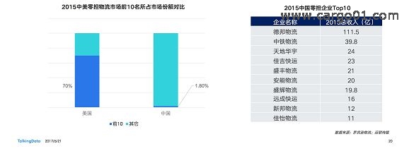 中國公路運輸的企業有78萬家,“小”“散”“亂”“差”是行業最主要的問題。他們經常表現為一人一車一電話的作坊模式。中國零擔市場前10名市場份額之和占行業整體的1.8%,美國零擔市場前10市場份額之和卻高達70%。頭部廠商的市場份額大,有利于充分調配資源,達到降低成本提升效率的目的。