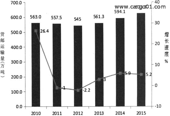 受歐債危機以及國際經濟不景氣的影響,2011年和2012年中國航空貨運量均有小幅下降,2011年~2015年期間總體呈現出“緩中趨穩、穩中有增”的趨勢。交通運輸部《2015年交通運輸行業發展統計公報》顯示,2015年全國民航完成貨郵運輸量625.3萬噸,貨郵周轉量207.27億噸公里,分別比上年增長5.3%和10.9%。2015年全國民航運輸機場貨郵吞吐量較上年增長3.9%,共計完成1409.4萬噸。[3]2010年~2015年民航貨郵運輸量詳見圖1。