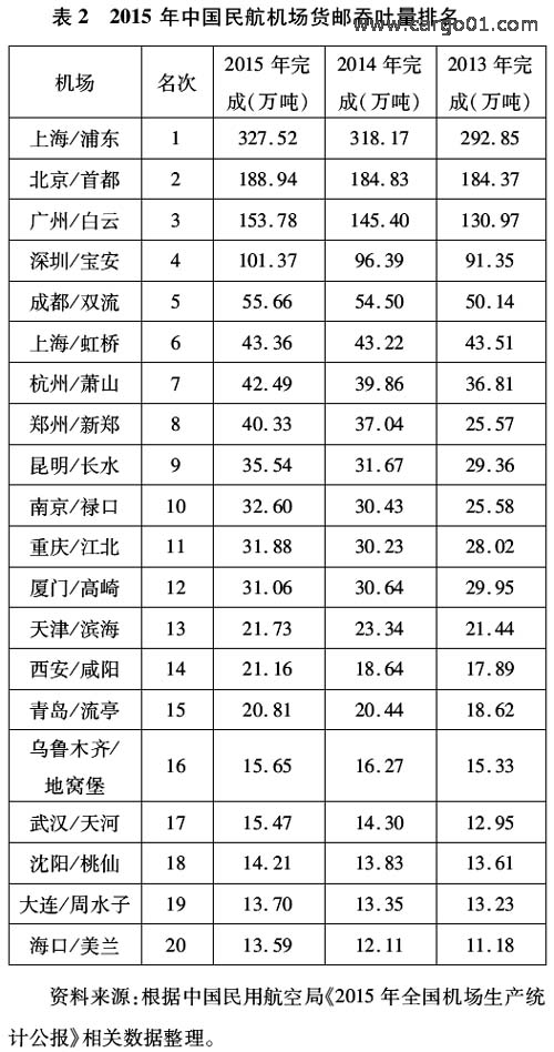 近年來,民航局和各級政府進一步加快航空物流基礎設施建設,中國機場數量不斷增加,機場規模不斷擴張。2010年,機場系統完成固定資產投資總額441.5億元。2013年,機場系統完成的固定資產投資總額達到507.5億元。截止到2015年,我國大陸共有民用航空機場210個,其中定期航班通航機場206個,定期航班通航城市204個[4]。機場貨郵吞吐量逐步集中于少數機場,上海、北京和廣州三大城市機場的樞紐作用已日益顯現。2015年,共51個機場的年貨郵吞吐量達萬噸以上,其貨郵吞吐量與全國機場貨郵吞吐量相比,占比達到98.4%,北京、上海和廣州機場的貨郵吞吐量占比達到50.9%。其中,上海浦東國際機場的貨運吞吐量位居全球第三位。2015年中國民航機場貨郵吞吐量排名見表2。