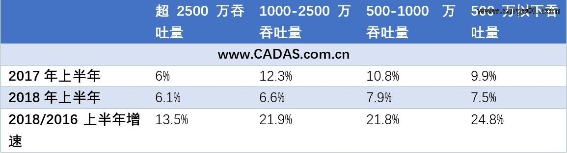 從不同規(guī)模機(jī)場(chǎng)吞吐量增速觀察,2500萬(wàn)吞吐量以下機(jī)場(chǎng)增速明顯放緩。但500-1000萬(wàn)吞吐量、1000萬(wàn)-2500萬(wàn)吞吐量規(guī)模機(jī)場(chǎng)增速持續(xù)保持領(lǐng)先。若對(duì)比2016年同期,可以觀察到中小機(jī)場(chǎng)明顯增長(zhǎng)更快。吞吐量超過(guò)2500萬(wàn)機(jī)場(chǎng)增速低于1000-2500萬(wàn)吞吐量機(jī)場(chǎng),一方面,反映出大型航空樞紐趨于飽和,另一方面,也反映出中等規(guī)模機(jī)場(chǎng)受低成本航空驅(qū)動(dòng)所帶來(lái)的變化。