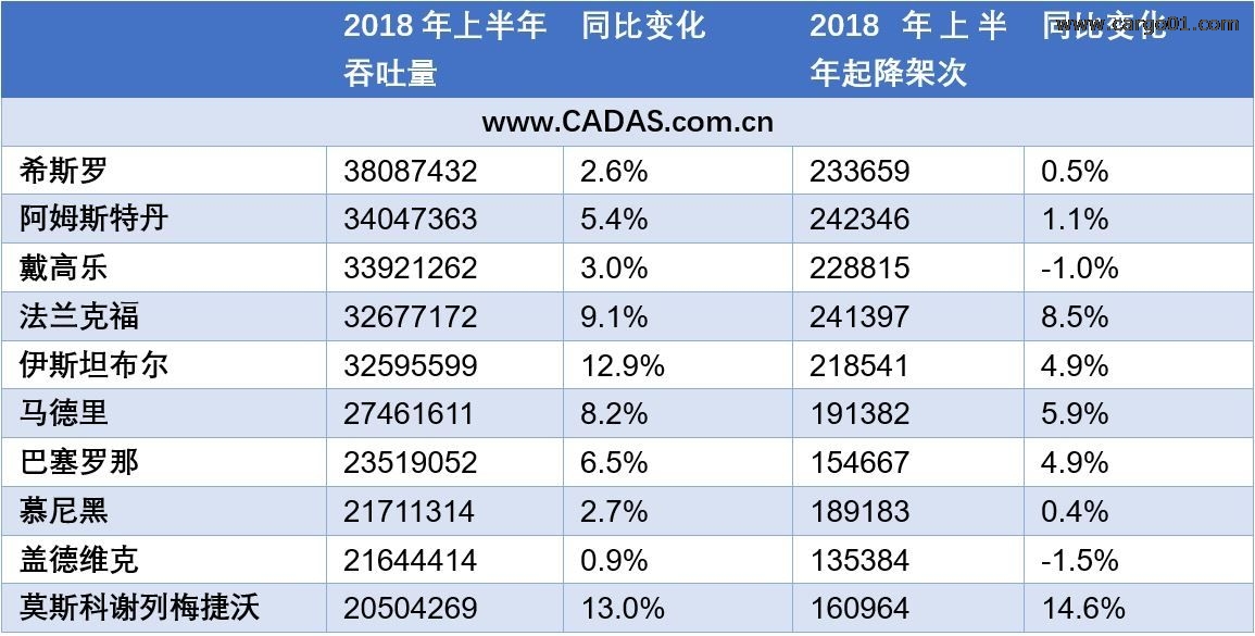 2018年上半年,五大航空樞紐吞吐量平均增速6.3%,較去年同期的4.3%明顯提升。五大樞紐半年吞吐量均超過(guò)3000萬(wàn)人次,去年同期僅有三大樞紐超過(guò)3000萬(wàn)人次。阿姆斯特丹機(jī)場(chǎng)超越戴高樂(lè)機(jī)場(chǎng)成為目前歐洲第二大機(jī)場(chǎng)。受到法航罷工影響的巴黎戴高樂(lè)機(jī)場(chǎng)增速僅為3%,容量飽和的希思羅機(jī)場(chǎng)增速為2.6%,較去年同期下降1.3個(gè)百分點(diǎn)。伊斯坦布爾機(jī)場(chǎng)以12.9%的增速保持最快增速,去年同期該機(jī)場(chǎng)吞吐量與起降架次均為負(fù)增長(zhǎng)。但目前土耳其經(jīng)濟(jì)形勢(shì)并不樂(lè)觀,為下半年持續(xù)增長(zhǎng)蒙上陰影。倫敦蓋德維克機(jī)場(chǎng)在歐洲前10位的機(jī)場(chǎng)中,吞吐量增速最低,起降架次負(fù)增長(zhǎng),值得一提的是蓋德維克機(jī)場(chǎng)去年同期吞吐量增速最高。倫敦也是唯一一個(gè)有兩個(gè)機(jī)場(chǎng)進(jìn)入前十的城市。
