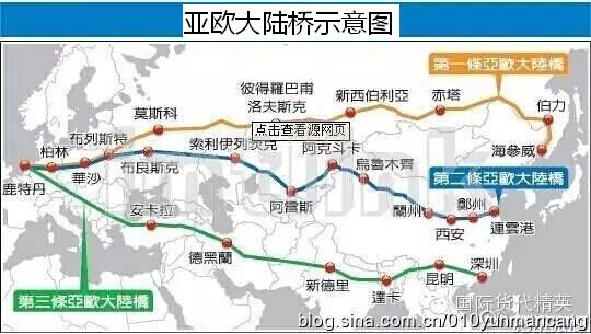 東起江蘇連云港,經隴海鐵路和蘭新鐵路,途經江蘇、安徽、河南、陜西、甘肅、青海、新疆7個省、區,出阿拉山口與哈薩克斯坦鐵路連接,貫通俄羅斯、波蘭、德國至荷蘭的鹿特丹港。全程距離比海運縮短9000公里,比經由傳統的西伯利亞大陸橋縮短3000公里,這條國際化鐵路運輸線極大推動了我國與歐亞各國的經貿往來。